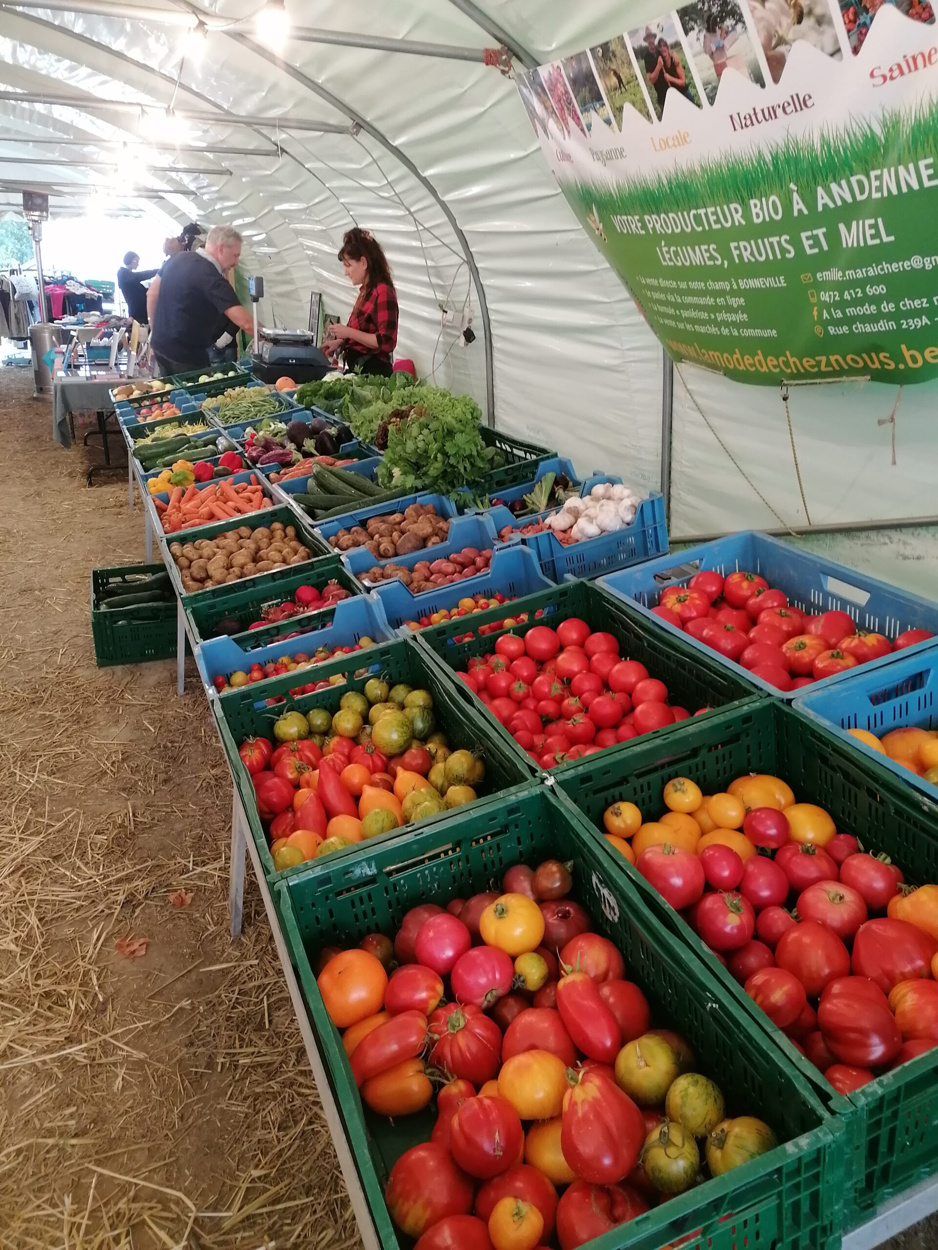 Maraicher maraichage fruit fruits légumes légume fromages fromage pain pains bières bière blonde ambrée triple artisan artisans artisanat bio circuit court tomate courges brocoli chou betterave pomme poire miel ruche brebis chèvre vélo livre bibliothèque vêtement four moulin farine carotte céleri oignon ail navet fête Andenne Bonneville marché terroir producteur froment blé avoine orge houblon vinaigre huile chips pâtes chocolat